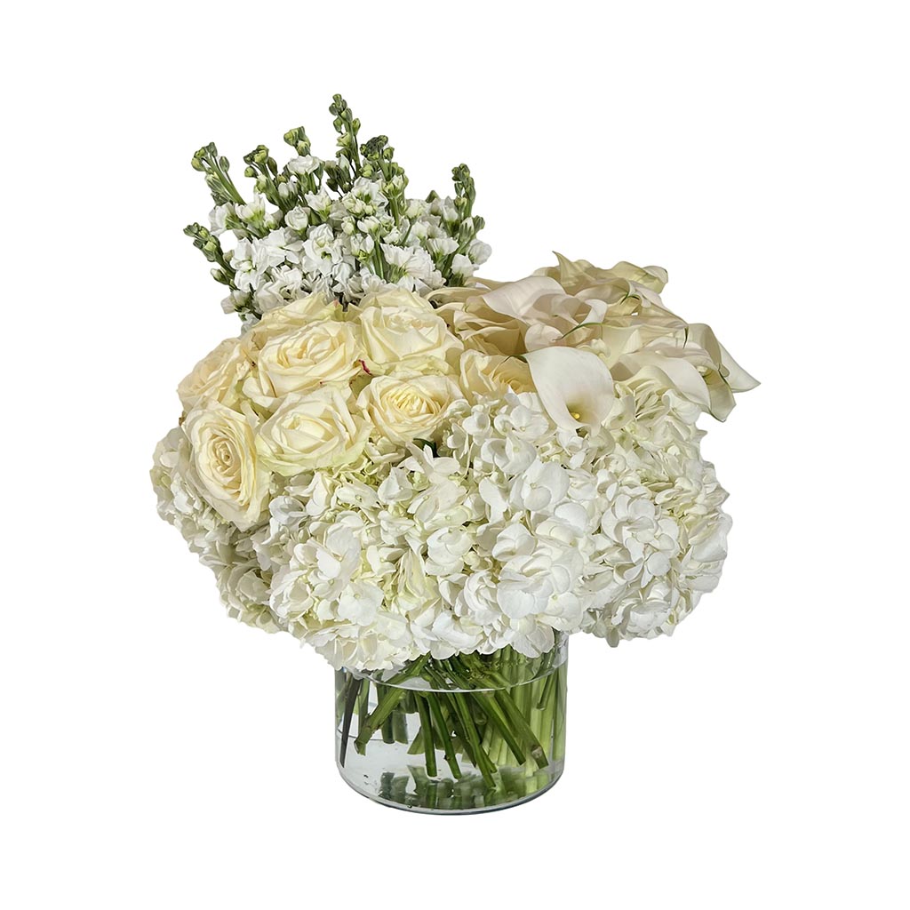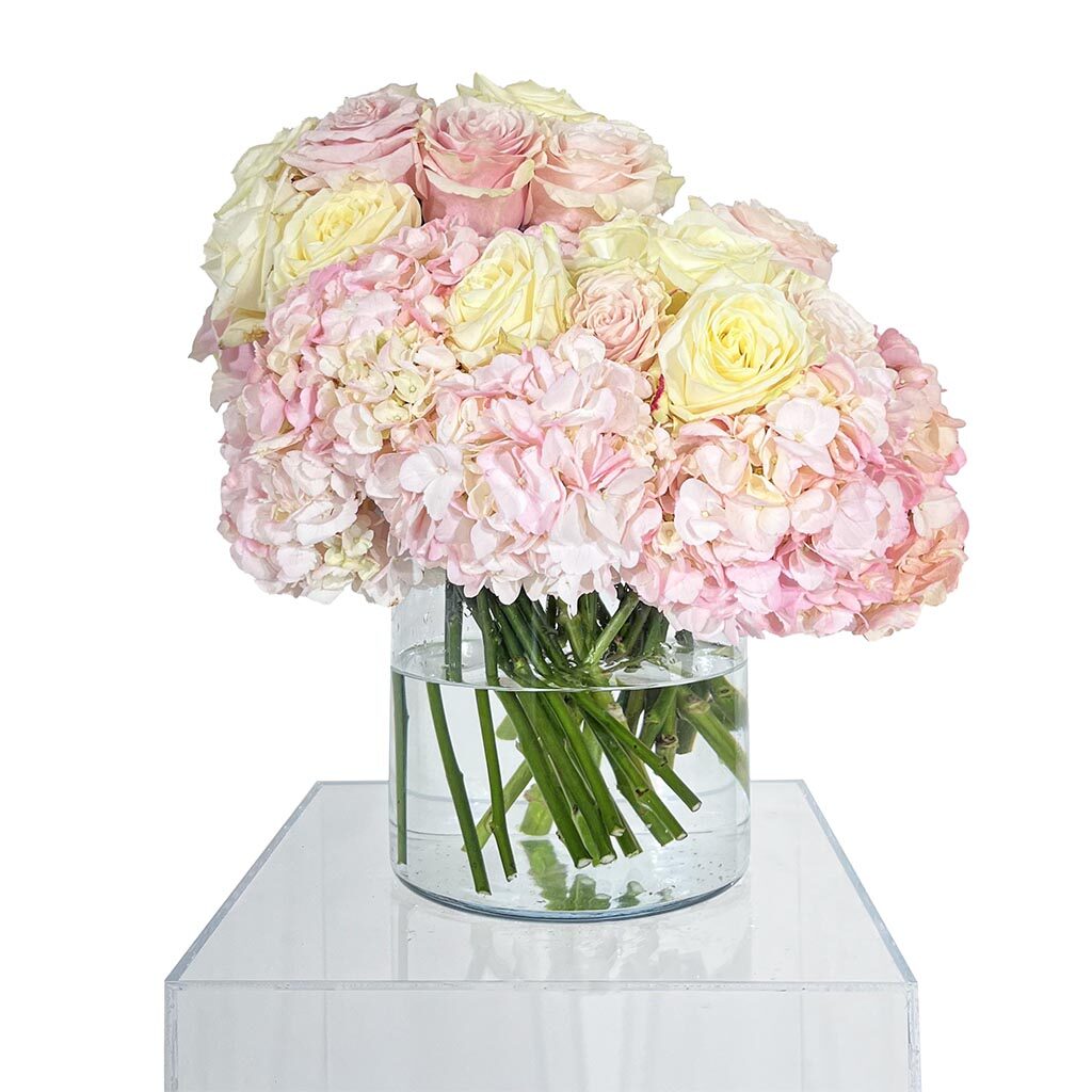 Buket u staklenoj vazi od 30 kala, 20 matiola, 10 ruža i 10 hortenzija.