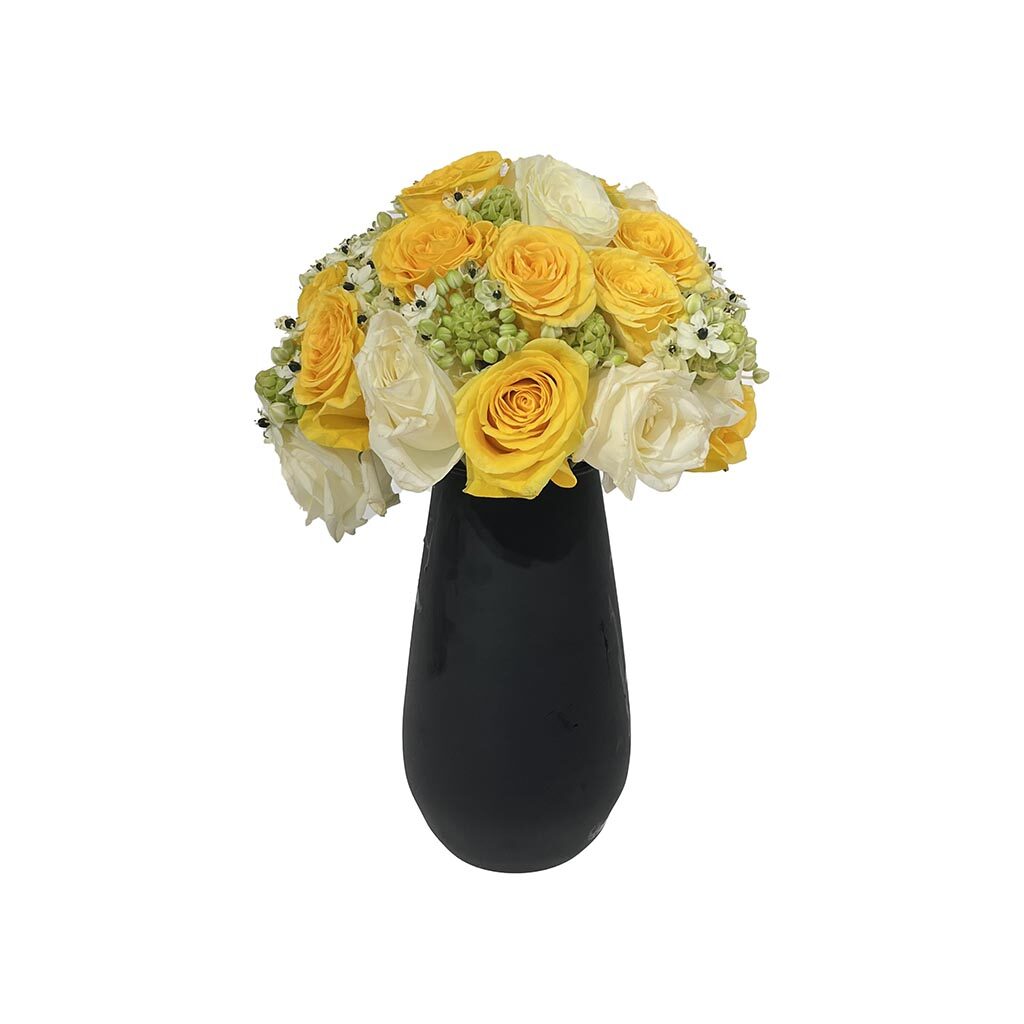 Aranžman od 75 žutih i rozih ruža u staklenoj vazi.