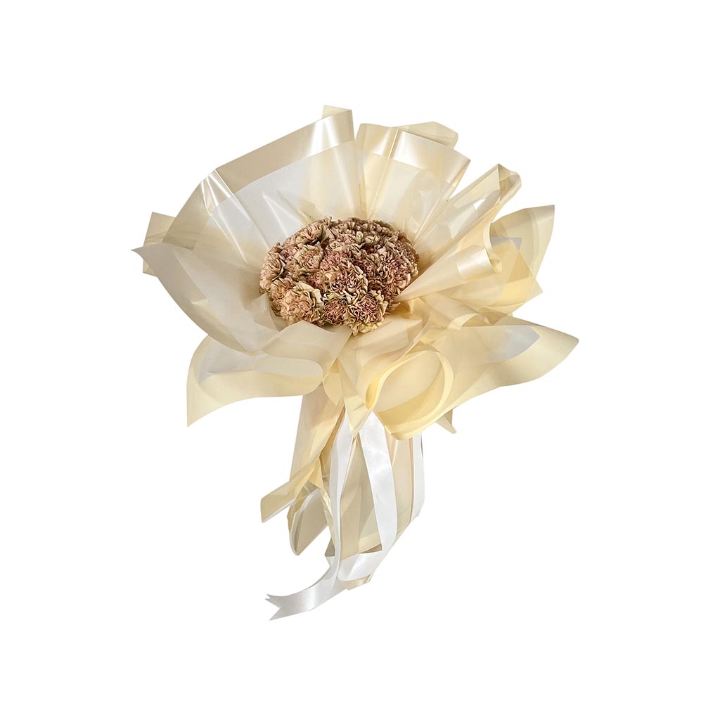 Buket od 20 bež karanfila omotan bež papirom te bijelom satenskom trakom.
