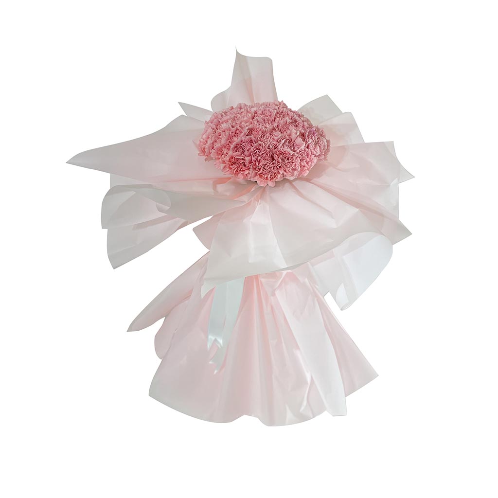 Buket od 20 rozih karanfila omotan bež papirom te rozom satenskom trakom.