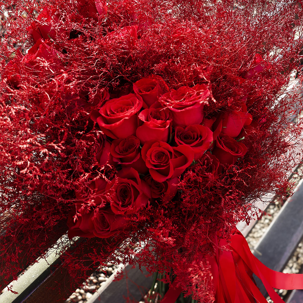 Romantični buket napravljen od sedamdeset i pet crvenih ruža uz kombinaciju crvenog Limoniuma te omotan crvenim papirom i crvenom svilenom trakom.