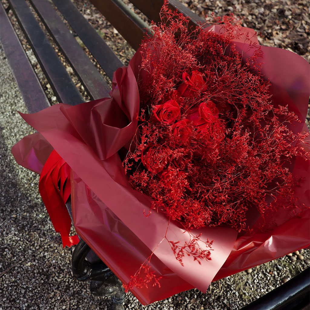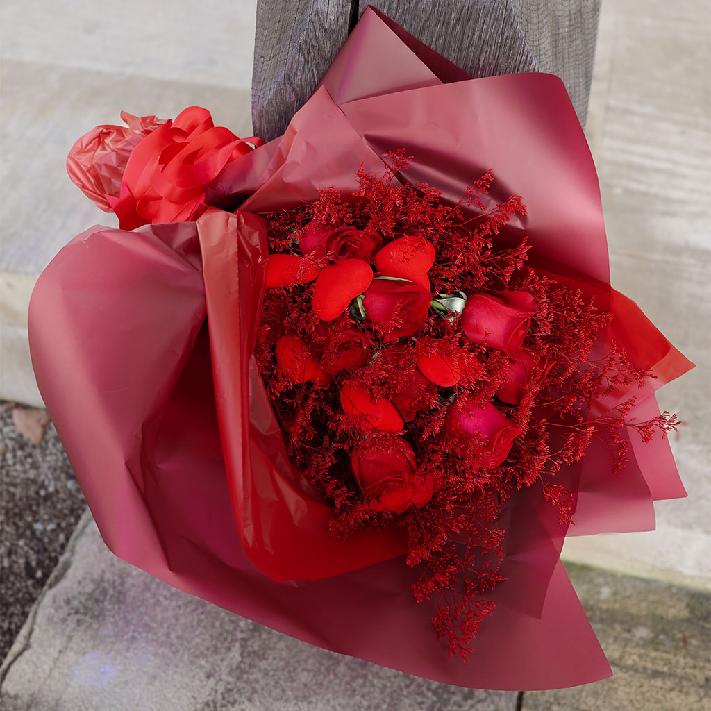 Romantični buket napravljen od petnaest crvenih ruža uz kombinaciju crvenog Limoniuma te omotan crvenim papirom i crvenom svilenom trakom.