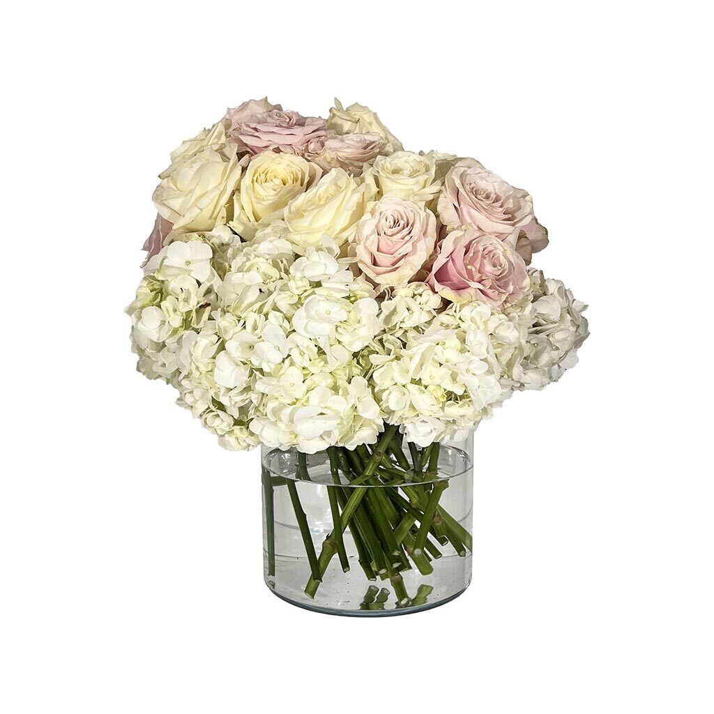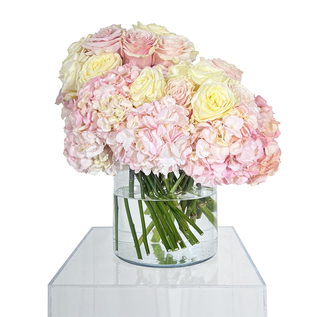 U staklenoj vazi napravljeni buket od 20 rozih, 20 bijelih ruža i 10 rozih hortenzija.