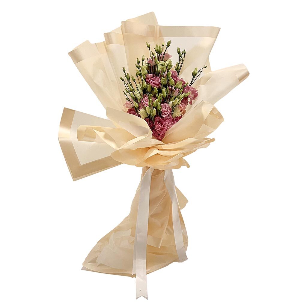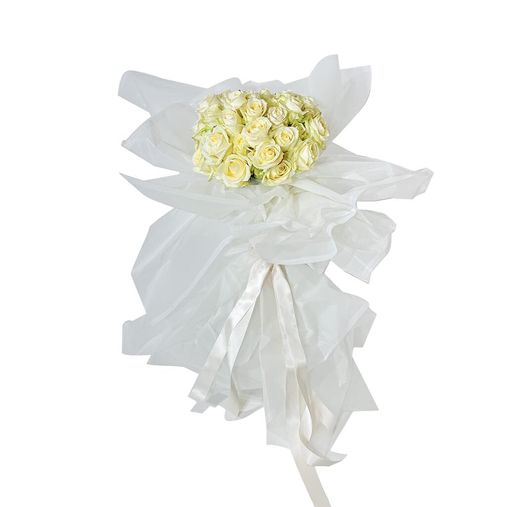 Buket od 20 grana bijelog lizijantusa omotan zelenim papirom i bijelom satenskom trakom.