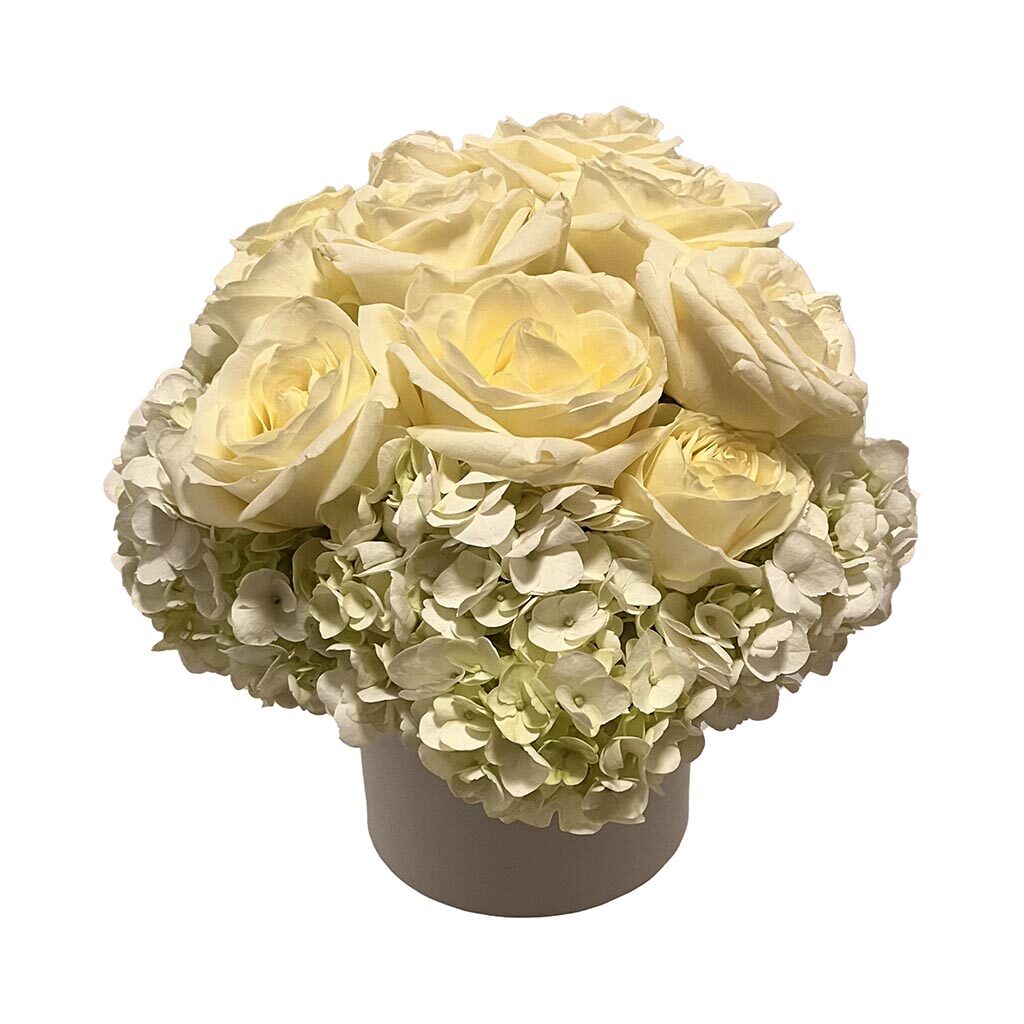 U razbarušenom snopu složen buket od rozih ruža omotan bijelom trakom.