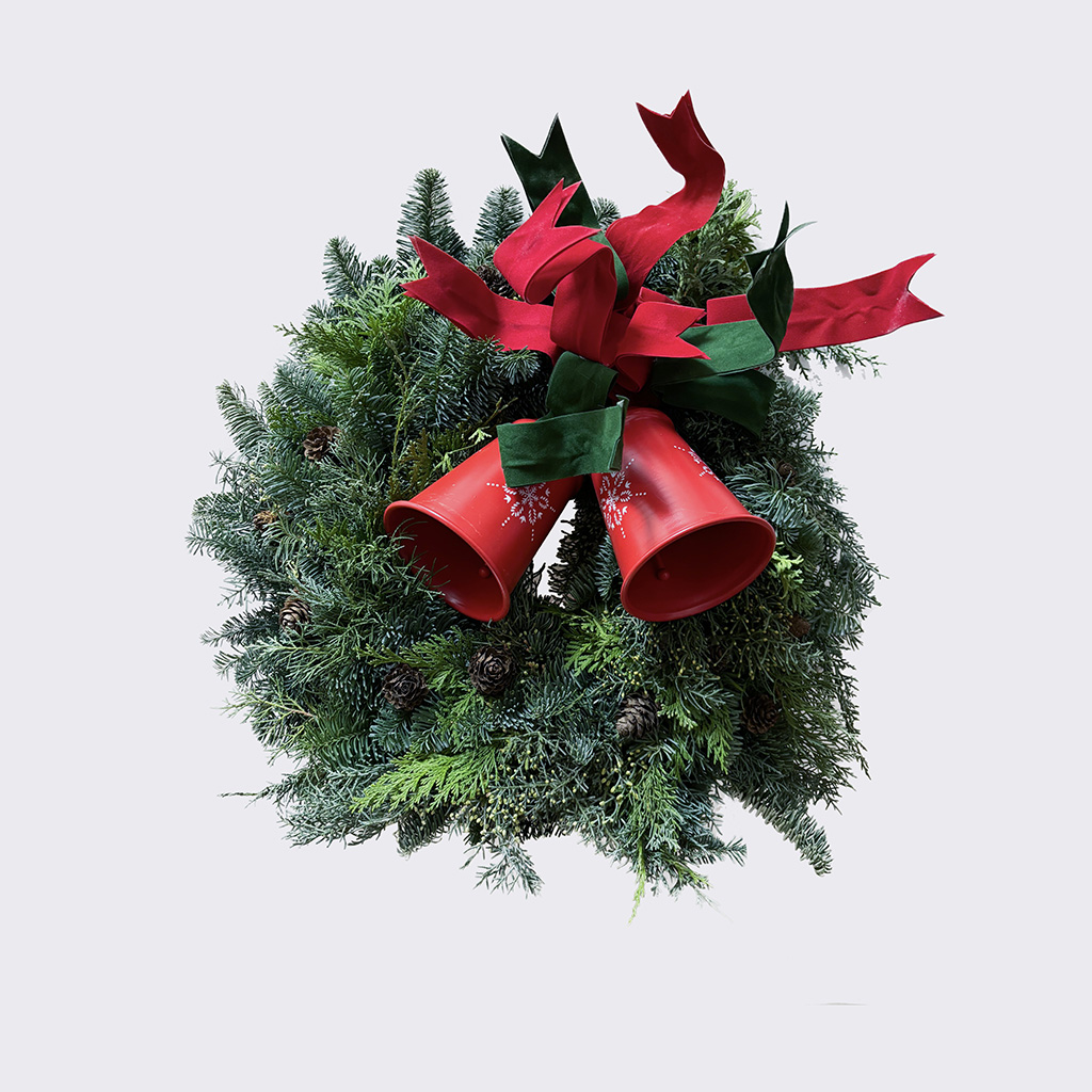 Adventski vijenac sa 4 bijele visoke svijeće obložen sa cvijetom pamuka. Promjer vijenca je 30 cm.